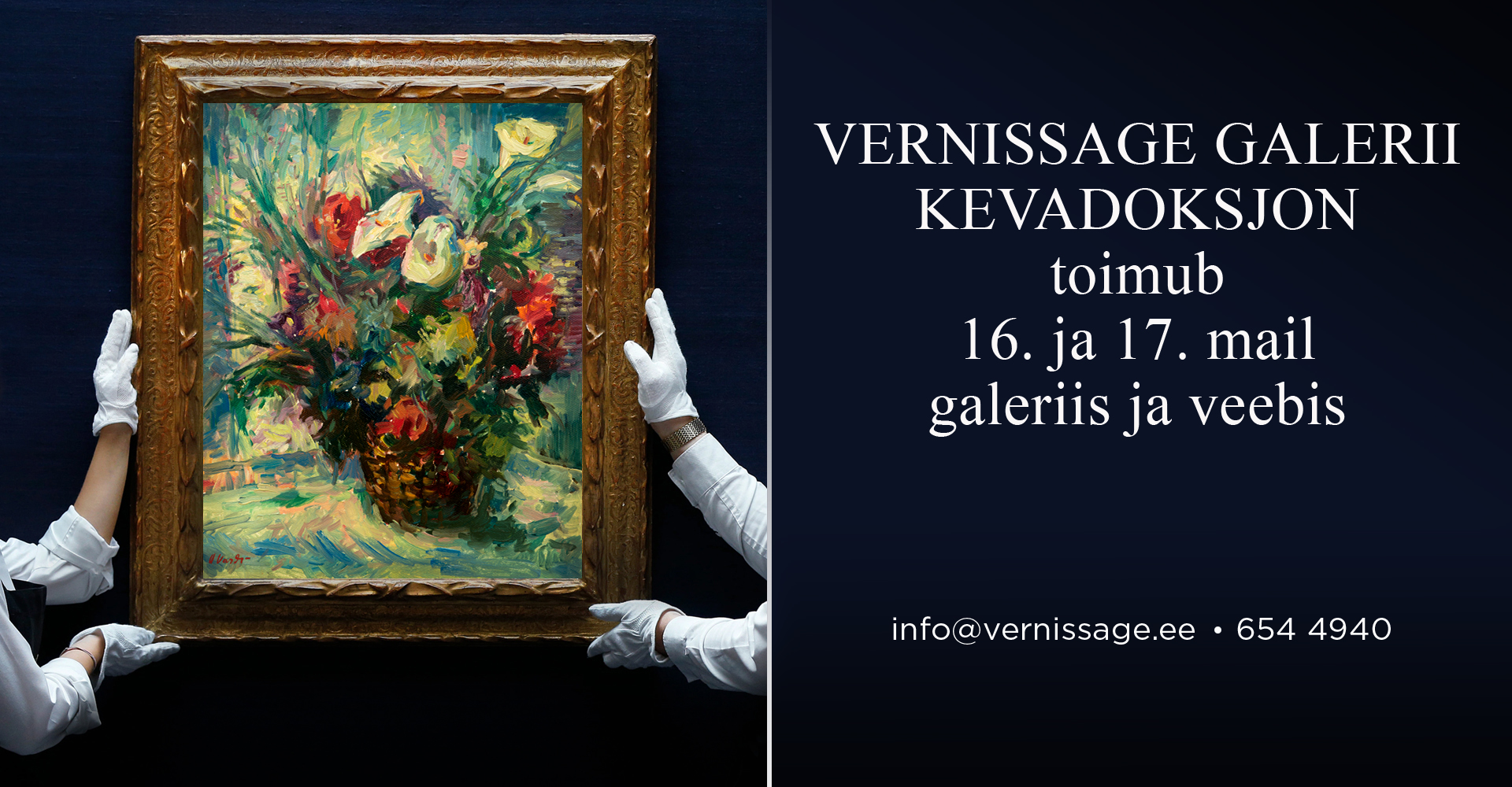 Avalehtadmin2026-04-13T11:43:45+00:00 VIIMATI LISATUDteosed Loe edasi Kevadoksjon 2026 Alo Hoidre. Tallinna Madonna. 1988. Lito, tempera. Nr. 9/20. Km 47,8 x 41,2 cm. ; Lm 55.5 x 47.9 cm. ; Km 48 x 41 cm. Alghind: 1500 € Loe edasi Kevadoksjon 2026 Joann Voldemar Saarniit. Vaade ateljeest. 1969. Õli. Masoniit. 55.5 x 32.2 cm. Alghind: 2400 € Loe edasi Kevadoksjon 2026 Leonhard Lapin. Naine masin III. 1975. Graafika. Kõrgtrükk, paber. Nr. A.E.13. Plm 40 x 38 cm. ; Lm 56.7 x 50.8 cm. Alghind: 1500 € Loe edasi Kevadoksjon 2026 Leonhard Lapin. Naine masin IV. 1975. Graafika. Kõrgtrükk, paber. Nr. A.E.9. Plm 39.6 x 37.4 cm. ; Lm 57 x 51 cm. Alghind: 1500 € Loe edasi Kevadoksjon 2026 Joann Voldemar Saarniit. Põhja Ontario.1977. Õli, masoniit. 76,3 x 45,4 cm. Alghind: 1300 € Loe edasi Kevadoksjon 2026 Märt Bormeister. Kivine rand. 1975. Õli, papp. 49 x 78,8 cm. Alghind: 1000 € Loe edasi Kevadoksjon 2026 Endel Kõks. Kentaur ja näkk. 1952. Graafika. Värviline vitrograafia (klaasitrükk), paber. Plm 35,8 x 46 cm. Alghind: 1300 € Loe edasi Kevadoksjon 2026 Concordia Klar. Mäng. 1987/2000. Graafika. Pehmelakk, ofort, akvatinta, värviline, paber. Plm 49,3 x 64,5 cm. Alghind: 1900 € Loe edasi Kevadoksjon 2026 Eduard Einmann. Natüürmort suveniiridega. 1961. Õli. Lõuend. 54 x 65 cm. Alghind: 2800 € Loe edasi Kevadoksjon 2026 Jüri Okas. Rekonstruktsioon PB I. 1977. Pb-1. Sügavtrükk, paber. Plm 49.6 x 49.6 cm. ; Lm 59.5 x 60 cm. Alghind: 900 € Loe edasi Kevadoksjon 2026 Eduard Einmann. Vana Tallinn. 1979. Õli, lõuend. 92.5×73 cm. Alghind: 6000 € Loe edasi Kevadoksjon 2026 Leonhard Lapin. Fallos VI. 1976. Kõrgtrükk, paber. Km 31,8 x 30 cm. ; Lm 61 x 59 cm. Alghind: 1100 € Tegeleme ka kunstinäituste ja -oksjonite korraldamisegaMeie galeriis leidub teoseid läbi Eesti kunstiajaloo, alates 19. sajandi lõpust kuni tänapäevani.KUNSTITEOSEDtelli mugavalt e-poestValige välja Teile sobivad kunstiteosed ja vormistage ost meie e-poes.Maal Akvarell Graafika Joonistus Vaata kõiki kategooriaid VERNISSAGEkunstigaleriiUuenenud Vernissage kunsti ja pildiraami salong tegeleb lisaks kunstiteoste vahendamisele ka piltide ja peeglite raamimisega. Vaata edasi