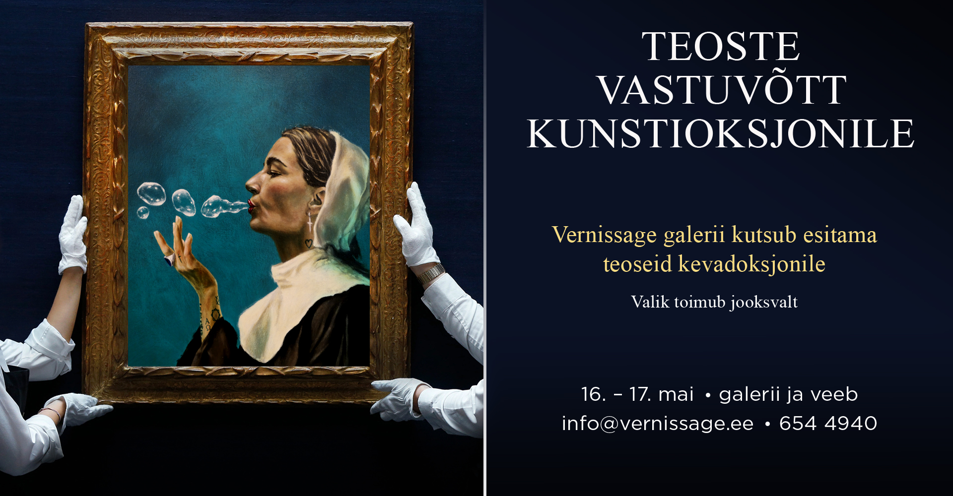Avalehtadmin2026-04-08T11:01:08+00:00 VIIMATI LISATUDteosed Lisa korvi Maal, Õli Lembit Saarts. Maastik järvega, 1964, Õli, lõuend 37 x 28 cm. 900.00€ Lisa korvi Maal, Õli Lembit Saarts. Kuuvalgel, 1962, Õli, lõuend 31 x 26 cm. 900.00€ Lisa korvi Maal, Õli Lembit Saarts. On õhtu, 2005 Õli. masoniit 45 x 38 cm. 2,100.00€ Lisa korvi Maal, Õli Märt Bormeister. Vana talu Põhja-Eesti rannakult II. 1970. Õli. Masoniit. 54 x 69,5 cm. 2,900.00€ Lisa korvi Akrüül, Maal, Õli Anatoli Strahhov. Mata Hari. Tantsida. 2024. Õli, lõuend. 60 x 62 cm 2,500.00€ Lisa korvi Graafika Evald Okas. Korstnad ja tornid. 1974. Akvatinta, paber. Plm 19.4 x 31 cm. ; Lm 24 x 36 cm. 850.00€ Lisa korvi Graafika Richard Kaljo. Kvartett. 1965. Graafika. Km 44.8 x 24.6 cm. 680.00€ Lisa korvi Graafika Peeter Ulas. Saaremaa sadam. 1963. Graafika, linool, paber. Km 22 x 30 cm. ; Lm 29.8 x 42 cm. 500.00€ Lisa korvi Graafika Jüri Arrak. Pilt vanast Tallinnast. 1976. Linool, paber. Km 30.2 x 35 cm. ; Lm 40 x 47 cm. 1,050.00€ Lisa korvi Graafika Mare Vint. Linnud. Graafika. Diam: 15.5 ; Lm 41 x 28 cm. 620.00€ Lisa korvi Graafika Mare Vint. Äralend. 1980. Lito, paber. Plm 30.7 x 30 cm. ; Lm 39.2 x 38 cm. 1,150.00€ Lisa korvi Graafika Vive Tolli. Istuv tüdruk. 1957. Graafika. Paber. Plm 30 x 22.5 cm. , Lm 41.5 x 31.6 cm. 600.00€ Tegeleme ka kunstinäituste ja -oksjonite korraldamisegaMeie galeriis leidub teoseid läbi Eesti kunstiajaloo, alates 19. sajandi lõpust kuni tänapäevani.KUNSTITEOSEDtelli mugavalt e-poestValige välja Teile sobivad kunstiteosed ja vormistage ost meie e-poes.Maal Akvarell Graafika Joonistus Vaata kõiki kategooriaid VERNISSAGEkunstigaleriiUuenenud Vernissage kunsti ja pildiraami salong tegeleb lisaks kunstiteoste vahendamisele ka piltide ja peeglite raamimisega. Vaata edasi