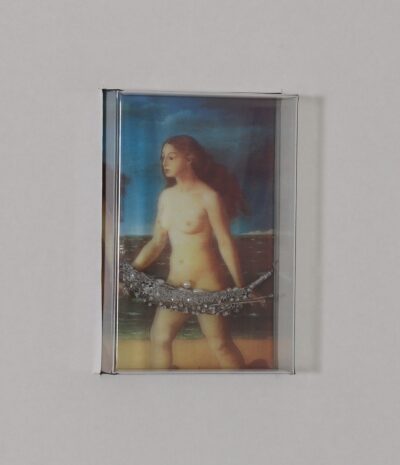 Urve Küttner. Veenuse sünd. 2017. Ehteinstallatsioon. Paul Delvaux’ maali fragmendi reproduktsioon, kollaaž, hõbe, helmed, klaaskuul