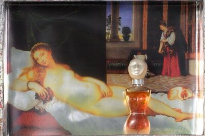 Urve Küttner. Urbino Veenus. 2010 Reprodetail Tiziani maalist “Urbino Veenus” (1538). J. Paul Gaultier’ parfüümipudelile modelleeritud hõbemaskis pea, joonistus, paljundus, värvipliiats.