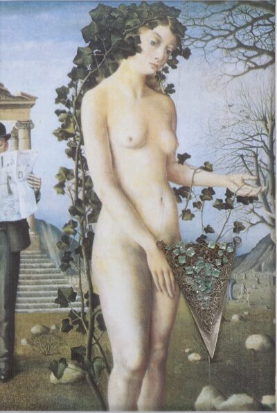 • Urve Küttner. Luuderohi (Mees tänaval). 2004. Ehteinstallatsioon. Paul Delvaux’ maali fragmendi reproduktsioon, hõbe, smaragdid