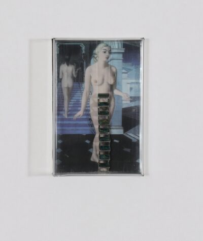 • Urve Küttner. Mere ääres I. 1999. Ehteinstallatsioon. Paul Delvaux’ maali fragmendi reproduktsioon, hõbe, Swarovski kristallid.