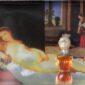 Urve Küttner. Alasti maja. 2010. Reprodetail Goya maalist “Alasti maja” (1806). J. Paul Gaultier’ parfüümipudelile modelleeritud hõbemaskis pea, joonistus, paljundus, värvipliiats.