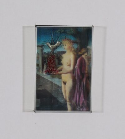 Urve Küttner. Mere ääres I. 1999. Ehteinstallatsioon. Paul Delvaux’ maali fragmendi reproduktsioon, hõbe, Swarovski kristallid.