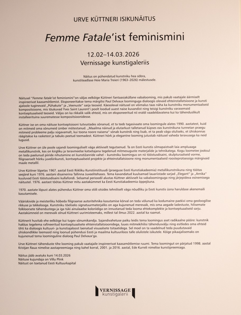 Meil on au paluda Teid Eesti ühe mitmekülgseima metallikunstniku Urve Küttneri juubelinäituse “Femme fatale’ist feminismini” avamisele 11.02.2026 kl 17.00.